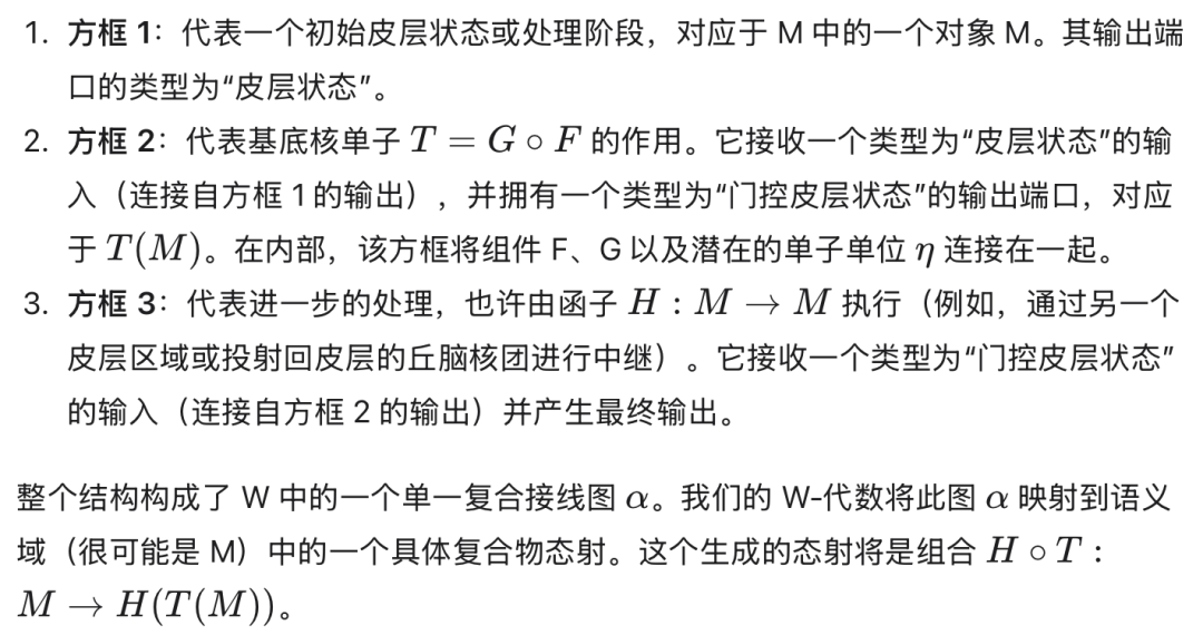 • 乘法态射 μ: M⊗M→M 代表内部变换的组合或微柱状态随时间的演变。张量积 M⊗M 代表一种组合状态信息的方式(例如,当前状态和输入,或时间 t 的状态和时间 t+1 的状态以产生 t+2 的状态)。结合律公理 (μ ∘ (μ ⊗ idM) = μ ∘ (idM⊗μ) ∘ α) 确保这些内部动力学的顺序组合表现一致。