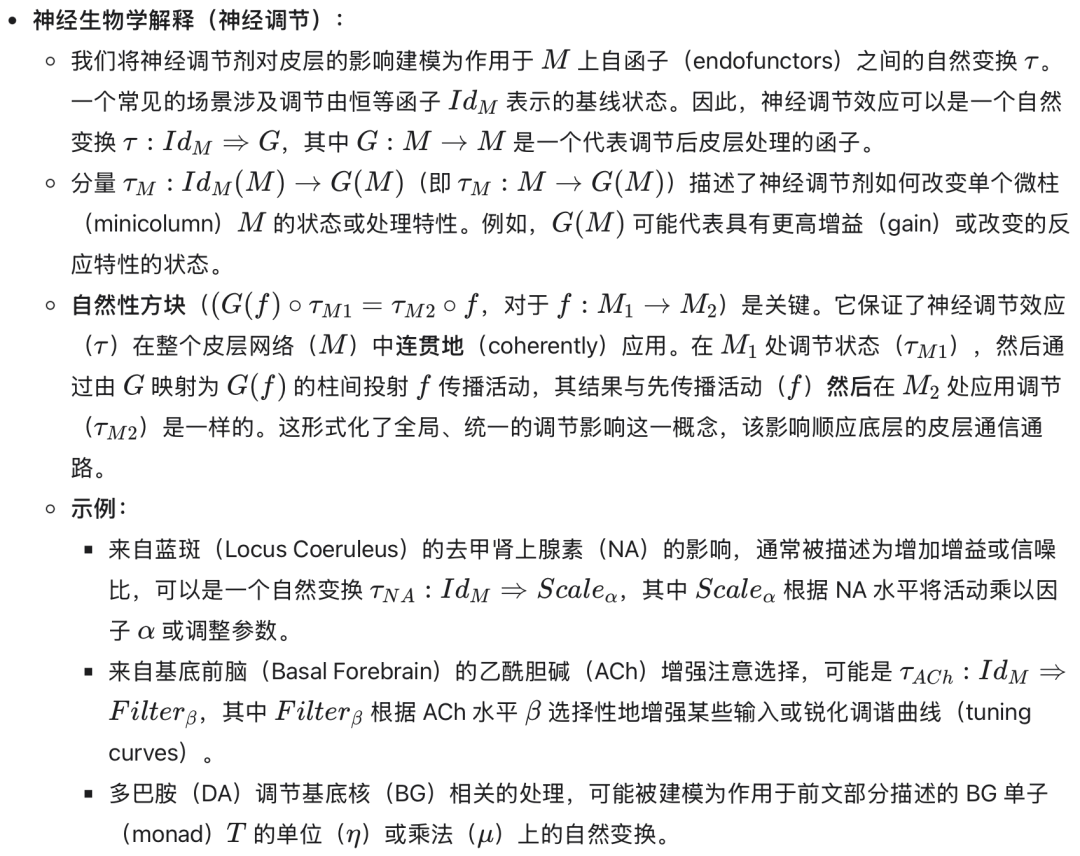 总之,范畴 M 为新皮层提供了一种形式化表示,将其视为由计算结构化单元(幺半群对象)组成的网络,这些单元通过尊重该结构的通路(幺半群同态)连接。这为我们将在后续章节中构建与皮层下系统相互作用的模型奠定了基础。