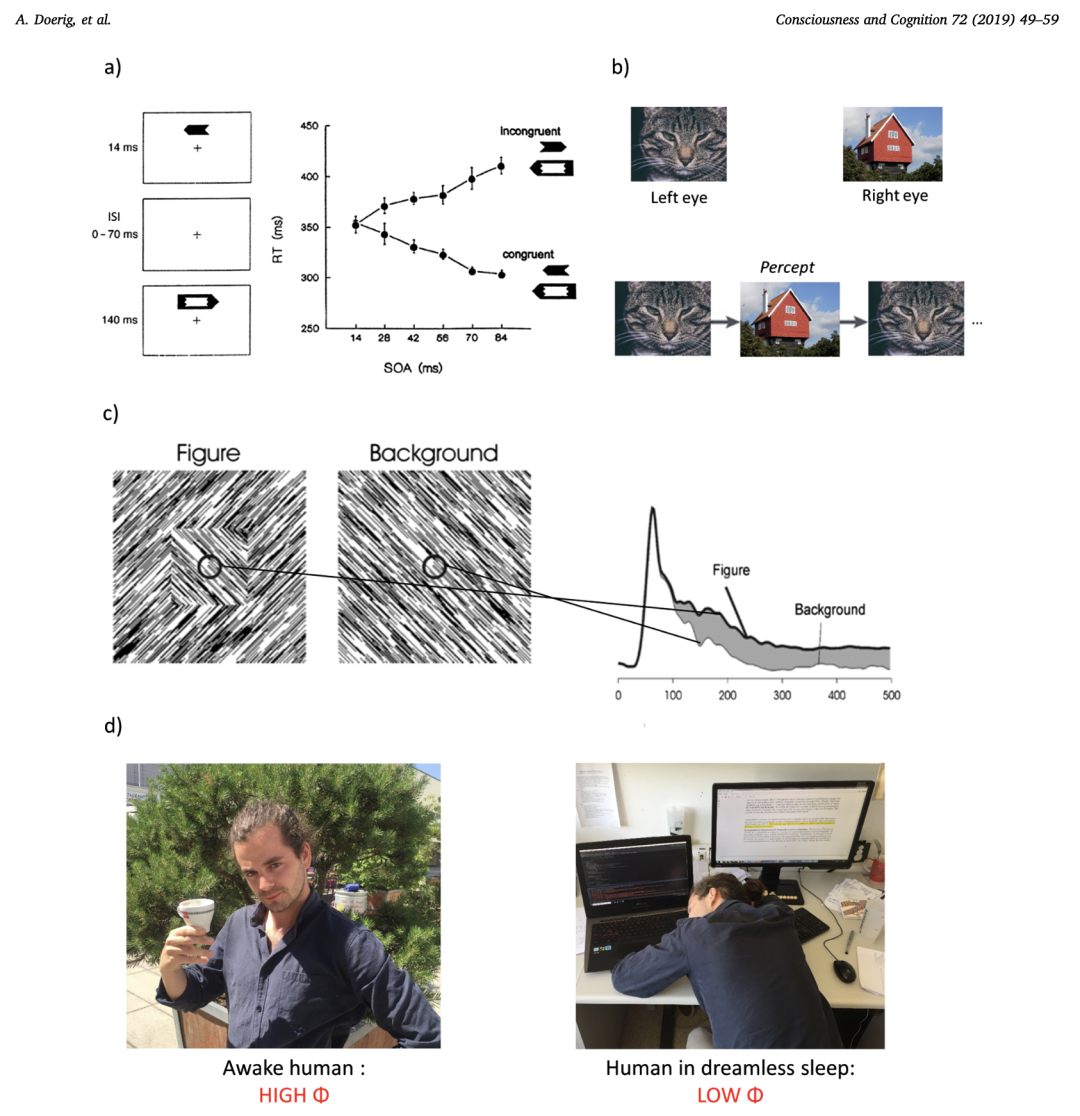 我们每天醒来,从无意识状态过渡到有意识状态。显然,这其中必有待解释之处。在双眼竞争和视觉掩蔽中,我们可以使清晰可见的刺激变得不可见。显然,此处同样必有待解释之处。这些例子以及许多其他例子,被科学界常规用作研究意识的手段,且处于所有注重实证的意识理论的核心位置(图 1a)。由于意识的主观性,这些实验中的因变量测量为主观报告(或其他已知与主观报告可靠相关的测量)。我们不能将脑活动测量作为意识的先验指标,因为我们首要想要理解的是脑活动如何产生意识。
