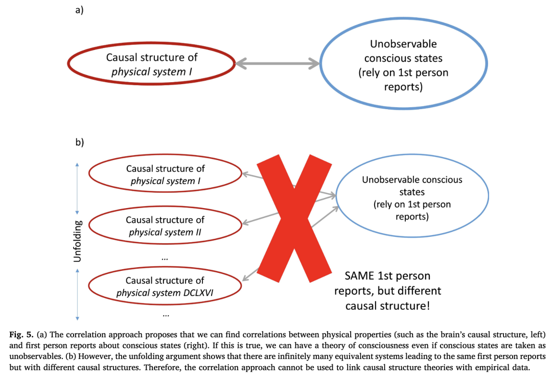 由于展开论证,这种方法不能适用于因果结构理论(图 5)。如前所述,有无限多个等价系统产生与人类完全相同的第一人称报告,但具有完全不同的因果结构。因此,依靠第一人称报告将意识属性与大脑的因果结构联系起来是不可能成功的(图 5)。相关方法不能适用于因果结构理论,尽管它可能(也可能不)对其他意识理论成功。