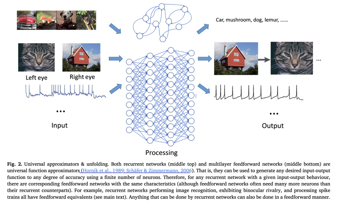 前馈神经网络也是通用函数逼近器(图 2; Hornik, Stinchcombe, & White, 1989)。因此,对于给定的输入-输出函数,我们可以找到前馈网络和递归网络,它们以不同的方式实现相同的函数(LeCun, Bengio, & Hinton, 2015; Oizumi et al., 2014; Werbos, 1988)。例如,如果存在一个执行图像识别的递归网络,那么就存在一个同等效果的前馈网络。如果存在一个表现出双眼竞争特征的递归网络,那么就存在一个同样如此的前馈网络。如果存在一个以一组脉冲序列作为输入并输出另一组脉冲序列的递归网络,那么就存在一个做同样事情的前馈网络。任何可以由递归网络完成的事情,也可以以前馈方式完成(图 2)。我们称此为展开:任何递归网络都可以展开为实现相同函数的前馈网络。特别是,任何行为实验都可以被视为一个输入-输出函数,因此可以由递归网络和前馈网络两者实现。