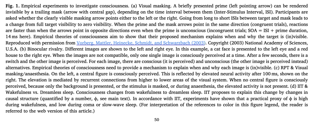 意识理论旨在解释所提出机制的变化如何导致从无意识状态到有意识状态的转变,反之亦然。为此,许多理论提出,理解意识的基本要素在于系统的各个部分如何相互作用。如果一个系统拥有“正确”类型的因果结构,换言之,如果其元素以“正确”的方式相互作用,它就是有意识的。否则,它就不是。我们将此类理论称为因果结构理论。例如,在递归处理理论(RPT)中,Lamme 提出递归处理对于意识而言既是必要的也是充分的(Lamme, 2006)。视觉前馈处理的首次扫描是无意识的。当递归的、自上而下的处理与初始前馈扫描期间激活的神经元相互作用时,意识便开始产生(Lamme, 2006)。根据 RPT,关键在于因果结构,因为意识仅取决于神经元如何彼此相互作用:存在递归处理时即有意识,否则便无意识。据提出,神经生理实验可为 RPT 提供实证支持(图 1c),在这些实验中,当视觉刺激被有意识感知时,递归处理增强了 V1 区的神经活动。当刺激未被有意识感知时(如在麻醉期间或刺激被掩蔽时),则不存在递归处理(Fahrenfort, Scholte, & Lamme, 2007)。