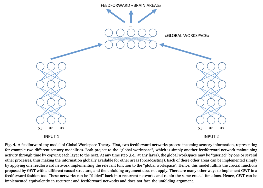 例如,GWT 的典型描述是,当编码特定意识内容(例如,感觉区域)的皮层区域在一个由高度递归的额顶叶区域组成的全局神经元工作空间中“广播”其信息,从而使这些内容可被其他区域广泛使用时,意识就会发生。这里的关键功能是 (a) 在感觉区域创建内容,以及 (b) 使这些内容可被其他区域广泛使用(即广播)。GWT 通常用递归网络来解释。尽管如此,等价的前馈网络可以维持相同的广播功能(见图 4 的一个玩具模型)。类似的玩具模型很容易为 HOTT、PPT 和所有其他功能主义理论制作。重要的是功能,例如广播,而不是(神经)实现。总之,功能主义理论与因果结构理论的重要区别在于,它们提出功能对意识至关重要,独立于它们的实现。例如,一个展开的全局工作空间网络保留了广播的关键功能。因此,就其本质而言,功能主义理论不受展开论证的影响。