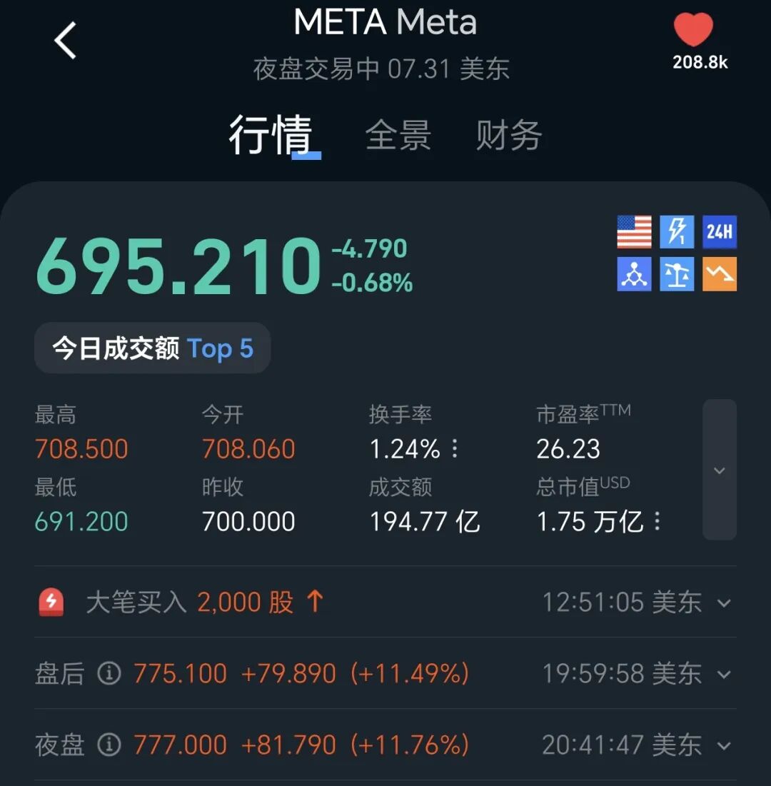 受此影响,Meta盘后大涨11%,市值触及2万亿美元。
