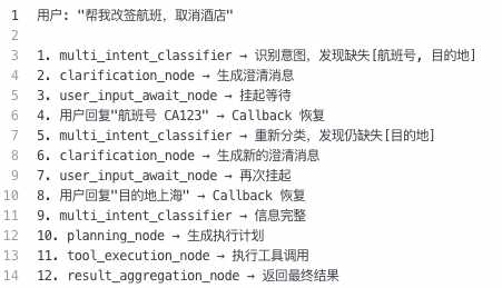 用户说:我下周去北京,帮我把行程改一下——航班改签、旧酒店取消、换一家离新会议地点近的、再加个租车。这个任务,涉及到多意图识别、任务规划、工具调用、结果生成。