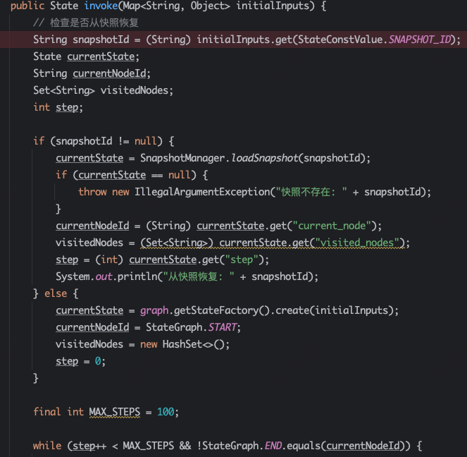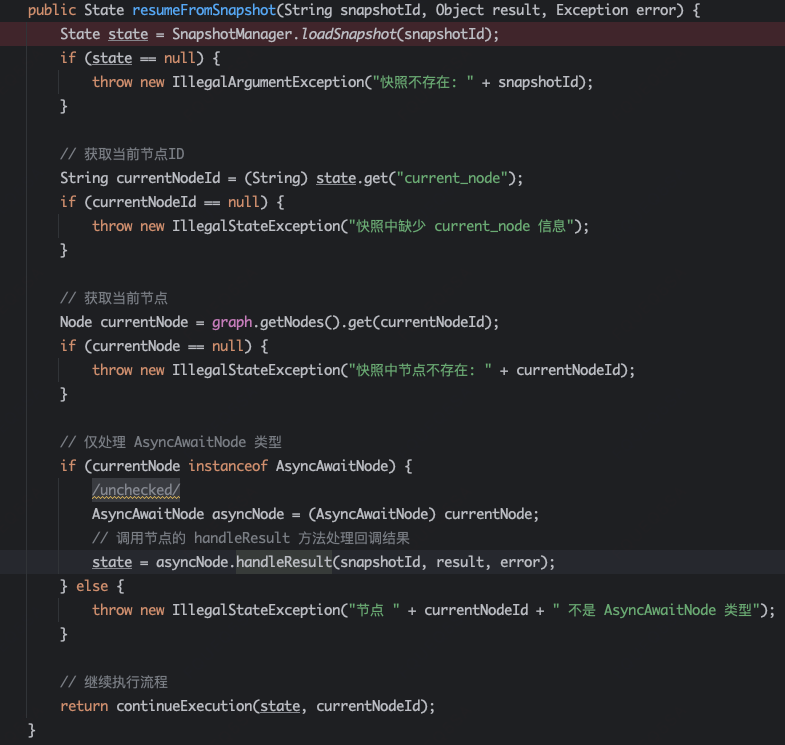 resumeFromSnapshot方法,用于崩溃恢复或者human-in-the-loop的回调,先从存储拿到快照,恢复执行,逻辑同Invoke类似。