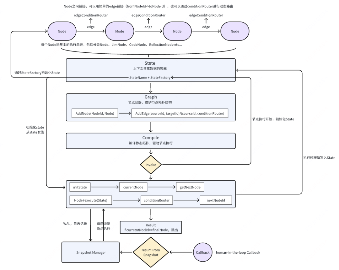再看一个AwaitNode节点,这是一个较为特殊的节点,服务于human-in-the-loop人工介入,比如需要人审批,那么先跳出主流程,人工审批完成之后,再通过持久化记录跳回主流程(Callback->resumeFromSnapshot)。