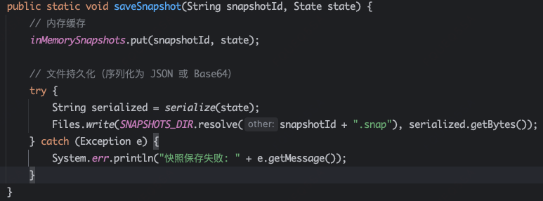 7、resumeFromSnapshot方法:崩溃恢复的回调入口,可以在human-in-the-loop节点之后回调恢复图执行;