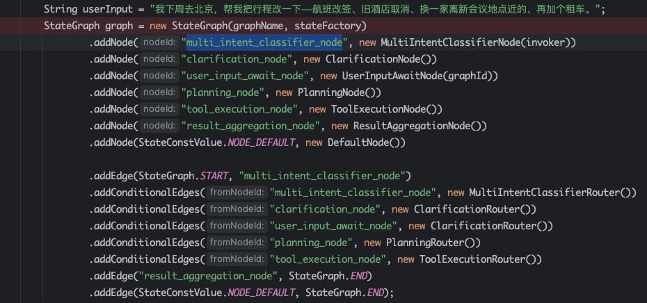 以一个分类器节点说明,图的入口往往从一个意图分类节点开始的,借助关键词、规则、模型识别进行意图识别,将识别出的意图放到State中,供后续流程使用。