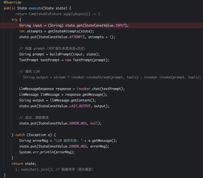 public interface Node { String getId(); State execute(State state); boolean isAsync(); // 是否异步执行 // 默认同步执行 default Node async() { return new AsyncNodeWrapper(this); } }