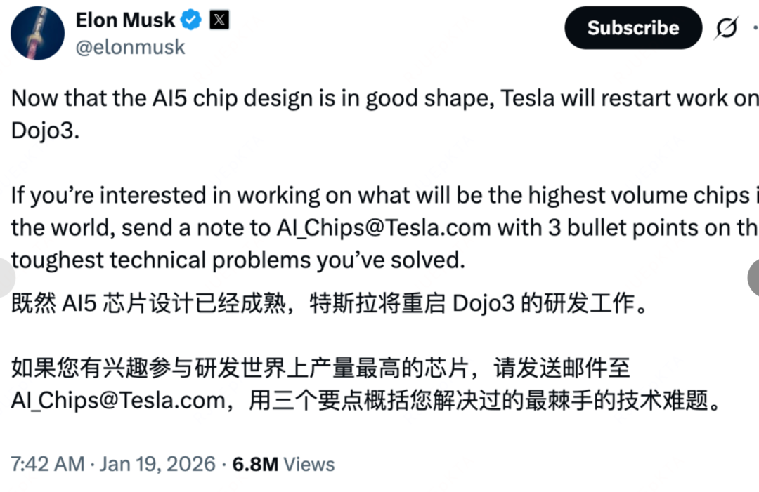 马斯克在x上透露,特斯拉将重启Dojo3研发工作,一口气推3款芯片。