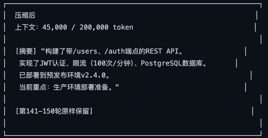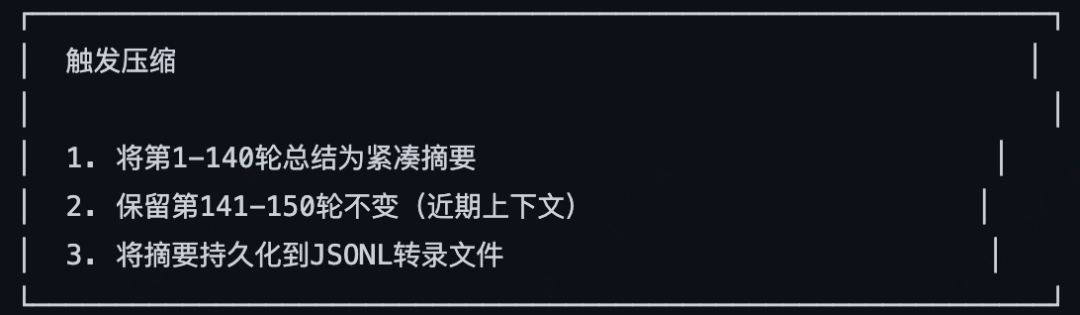 同时还会对旧的对话总结压缩(触发时机:接近上下文配额限制时触发、手动触发),保留最新消息的完整性。