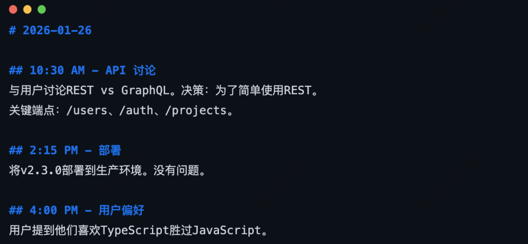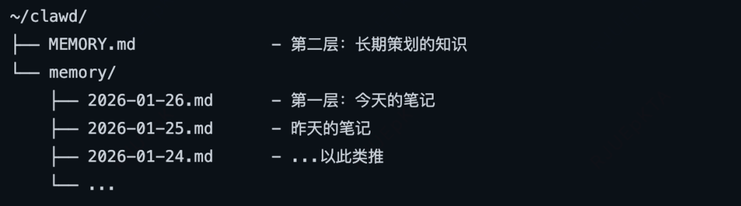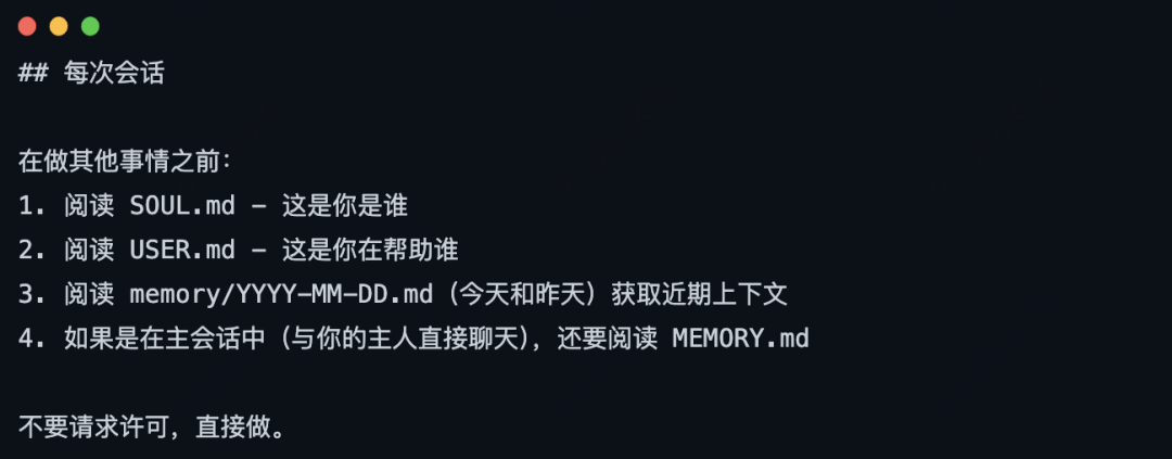 每日记忆是追加的,Agent会在一天中随时写入,比如Agent被告知“记住某件事”,就会写入到这里。