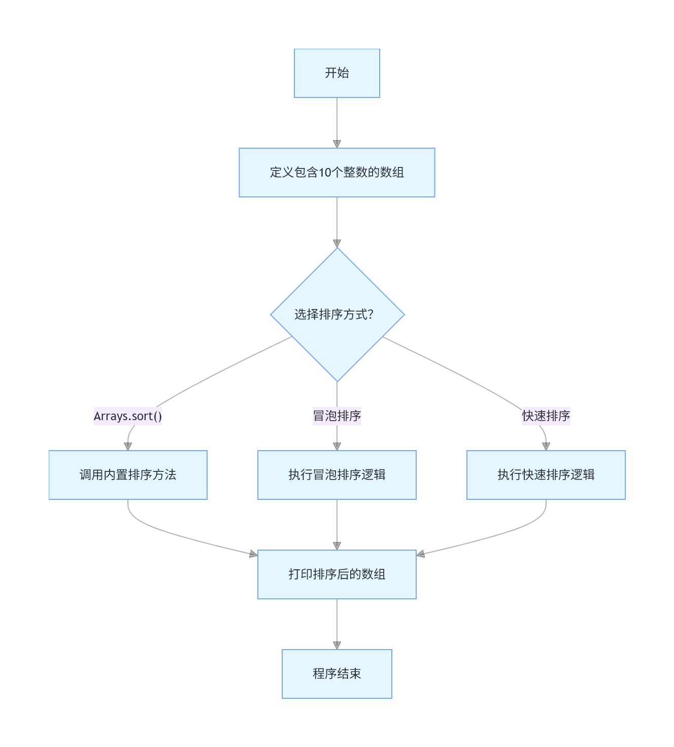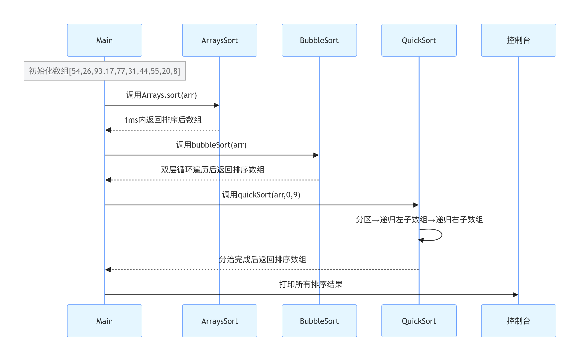int[] numbers = {54, 26, 93, 17, 77, 31, 44, 55, 20, 8};Java提供了一个非常方便的方法Arrays.sort(),可以直接对数组进行排序。这是最简单也是最快捷的方式。