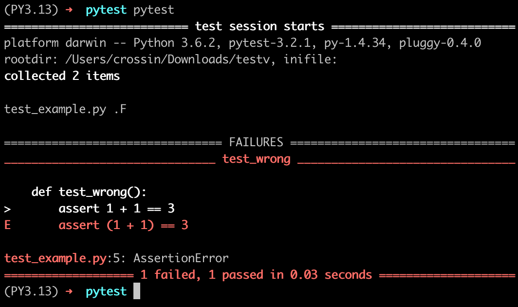 assert 1 + 1 == 3运行 pytest,输出会显示 assert 1 + 1 == 3 这行出错。