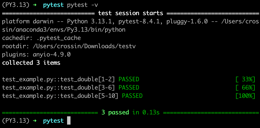 选项:使用 pytest -v 查看详细输出,显示每个测试的通过/失败状态。