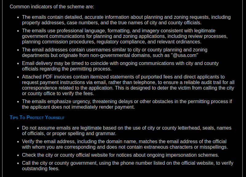 在获取目标信息后,攻击者进入邮件构造阶段。与传统钓鱼邮件不同,此类邮件在内容上达到了极高的仿真度。IC3的公告指出,邮件中包含了准确的规划请求信息、房产地址、案件编号以及真实的市县官员姓名。攻击者甚至模仿了政府公文的语言风格、格式排版以及官方 imagery,涵盖了审查流程、规划委员会程序、法规合规性等专业术语。