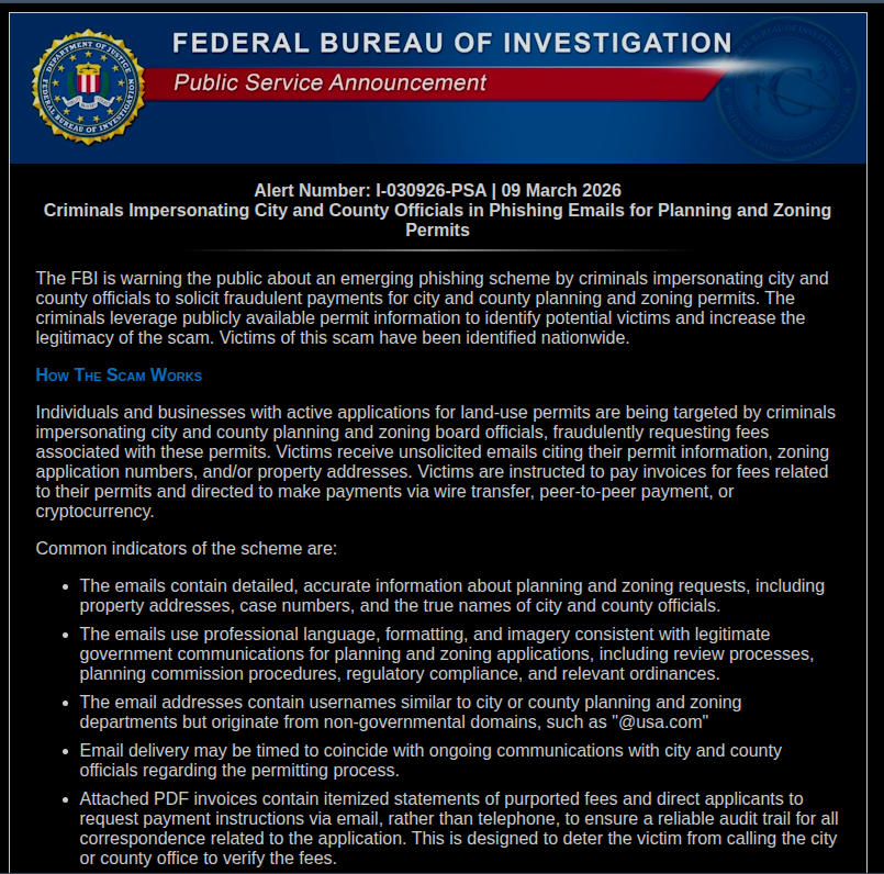 2026年3月9日,联邦调查局(FBI)下属的互联网犯罪投诉中心(IC3)发布了编号为I-030926-PSA的公共安全公告,详细披露了犯罪分子冒充市县官员,利用真实的许可申请信息实施诈骗的案例。该攻击手法的核心在于“信息增强”:攻击者不再凭空捏造故事,而是抓取受害者正在进行的真实业务数据(如地块地址、案件编号、官员姓名等),将其嵌入到精心伪造的通信中。这种基于真实上下文的攻击极大地降低了受害者的警惕性,使得传统的基于关键词过滤或发件人黑名单的防御手段失效。