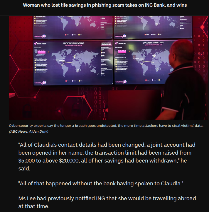 在数字化金融全面普及的今天,网络钓鱼(Phishing)已成为威胁个人财产安全的主要非接触式犯罪手段。攻击者利用社会工程学原理,伪造高仿真的银行界面诱导用户泄露敏感信息,进而实施资金窃取。传统的安全范式往往将防范责任主要置于用户端,强调个人的数字素养与警惕性。然而,随着攻击手段的精细化与自动化,单纯依赖用户端的防御防线已显得脆弱不堪。2026年3月披露的澳大利亚达尔文市民Claudia Lee诉ING银行一案,不仅是一起孤立的民事纠纷,更是检验现行银行安全防护体系有效性的典型案例。