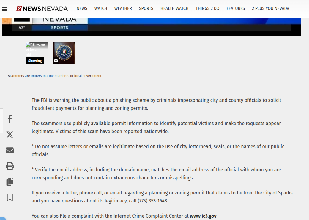 2026年3月,美国圣地亚哥地区媒体《2 News》报道了FBI发布的最新公共安全警示。该警示指出,犯罪团伙正冒充市县规划与分区部门官员,向正在申请建筑或开发许可的个人及企业发送高度逼真的钓鱼邮件。与传统钓鱼不同,这些邮件中包含了受害者真实的姓名、具体的房产地址、唯一的案件编号(Case Number)、甚至负责该案件的真实官员姓名。攻击者利用这些从政府官网直接抓取的公开信息,构建了极具迷惑性的叙事场景,声称需要立即支付审查费或处理费以避免项目延误。