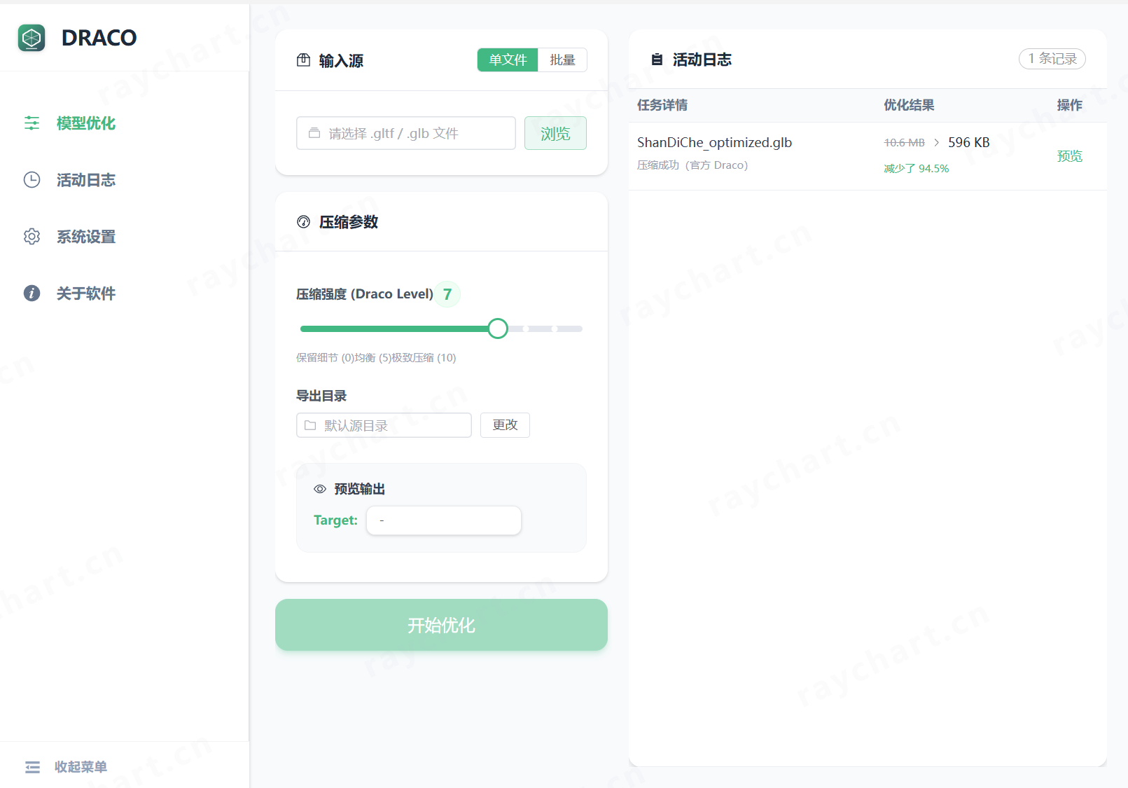 Draco Editor 是一款面向 Web3D 场景的桌面端模型优化工具,支持离线部署与本地化处理,专注于 glTF/GLB 模型的 Draco 压缩与格式转换。软件集成官方 Draco 算法与高性能 Rust 引擎,可显著降低 3D 模型在浏览器和实时渲染项目中的带宽占用与加载压力。