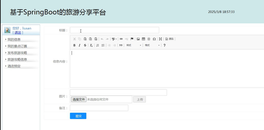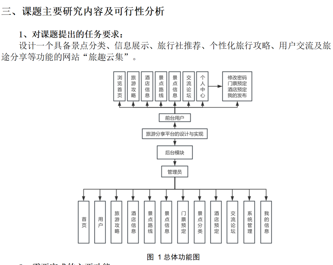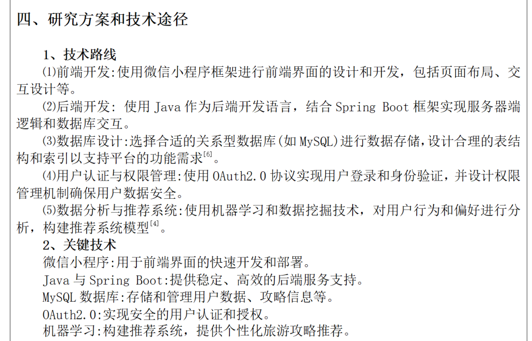 可行性分析:在技术实现方面,可以采用Spring Boot框架进行后端开发,结合MySQL数据库进行数据存储。前端可以使用React或Vue等框架进行开发,实现用户友好的界面和交互。平台功能可以包括用户注册与登录、旅游攻略发布、浏览与搜索、评论与评分、用户社交功能以及数据分析与推荐系统等。