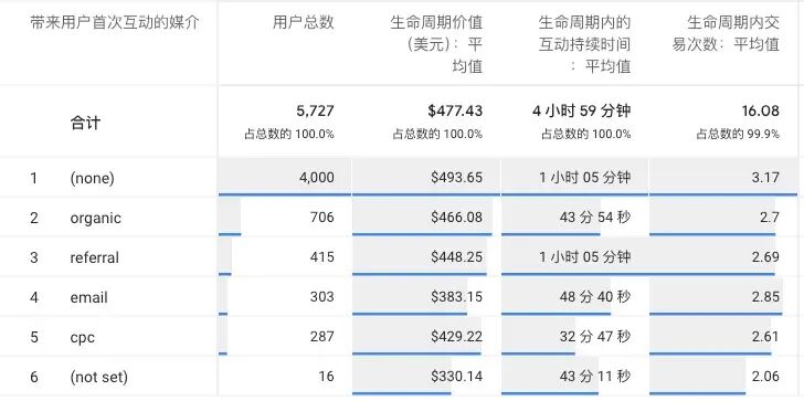 以下是某网站不同渠道用户在 30 天内的生命周期价值(LTV)表现: