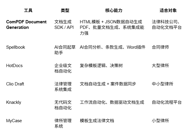 与传统法律文档自动化工具不同,ComPDF 更偏向 底层文档生成引擎,可以直接嵌入企业系统或法律科技产品。