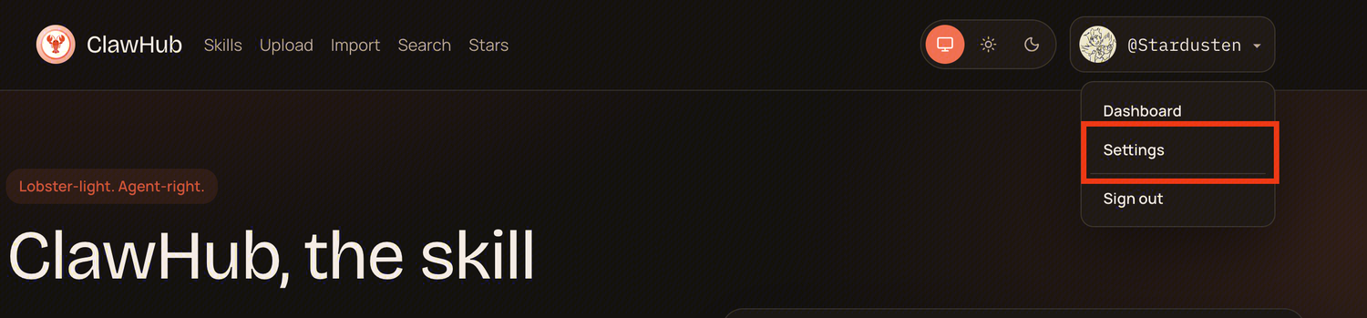 打开官网:https://clawhub.ai/注册并登陆,然后右上角点 Settings