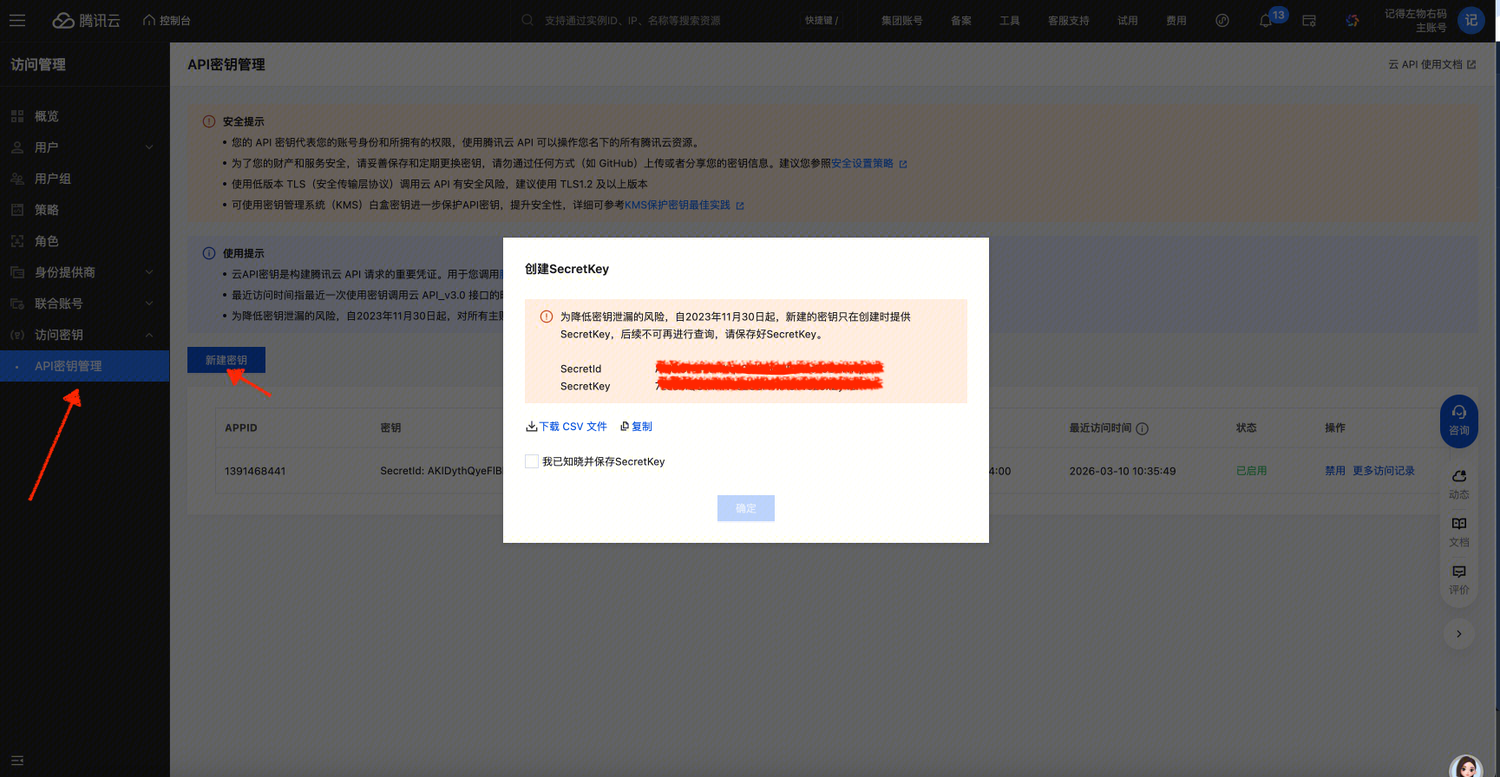 4、点击“API密钥管理”并继续点击“新建密钥”,并保存好SecretId 和 SecretKey