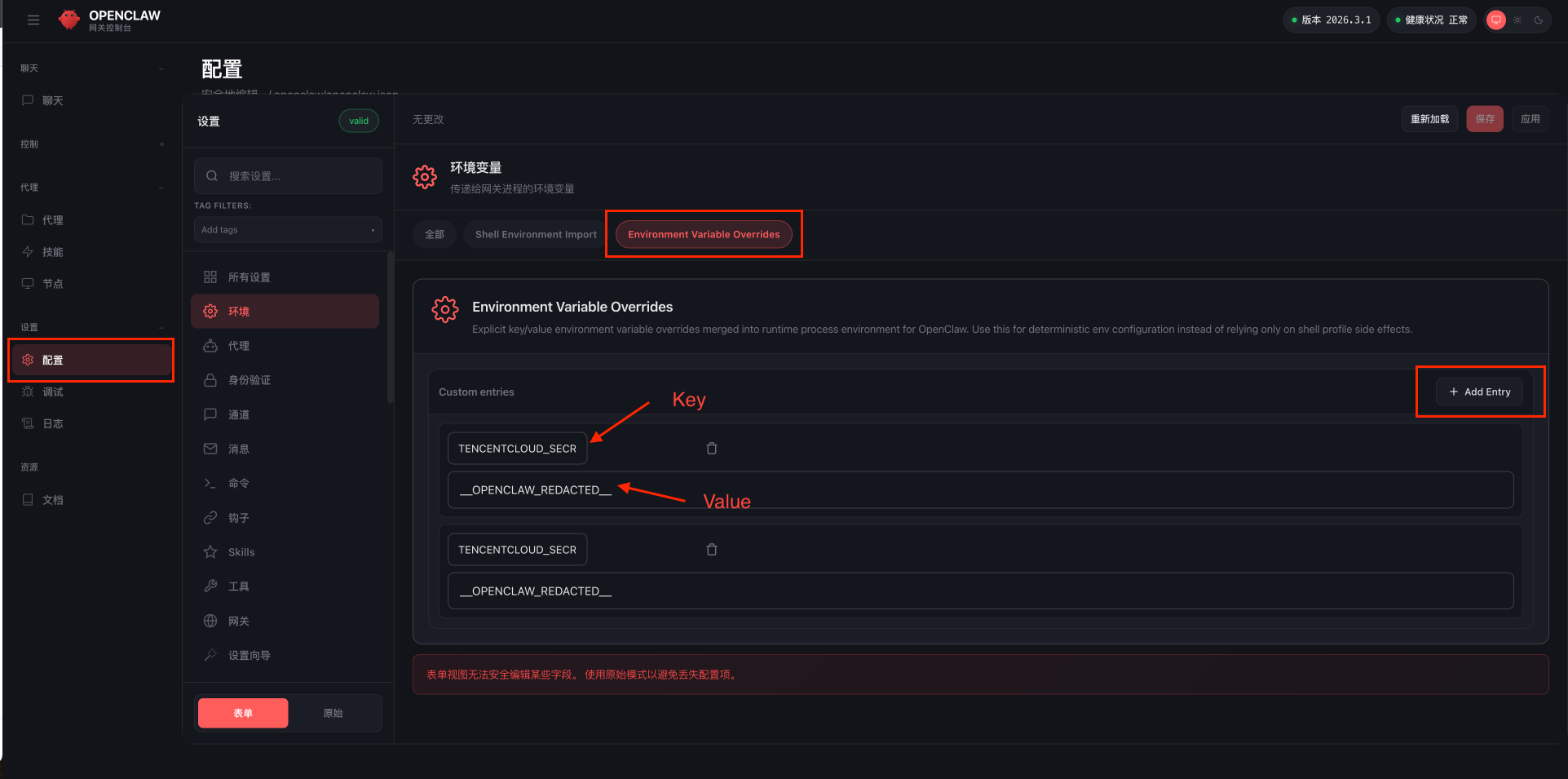 1、由于SecretId和SecretKey属于敏感信息,建议在OpenClaw的网关中进行环境变量的配置,如下图所示