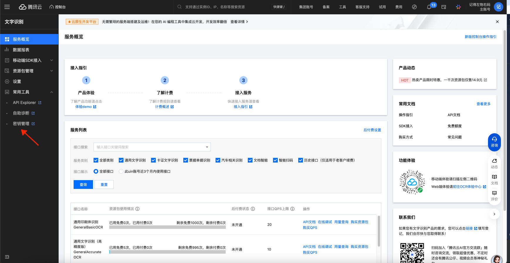 3、进入到控制台,点击“密钥管理”