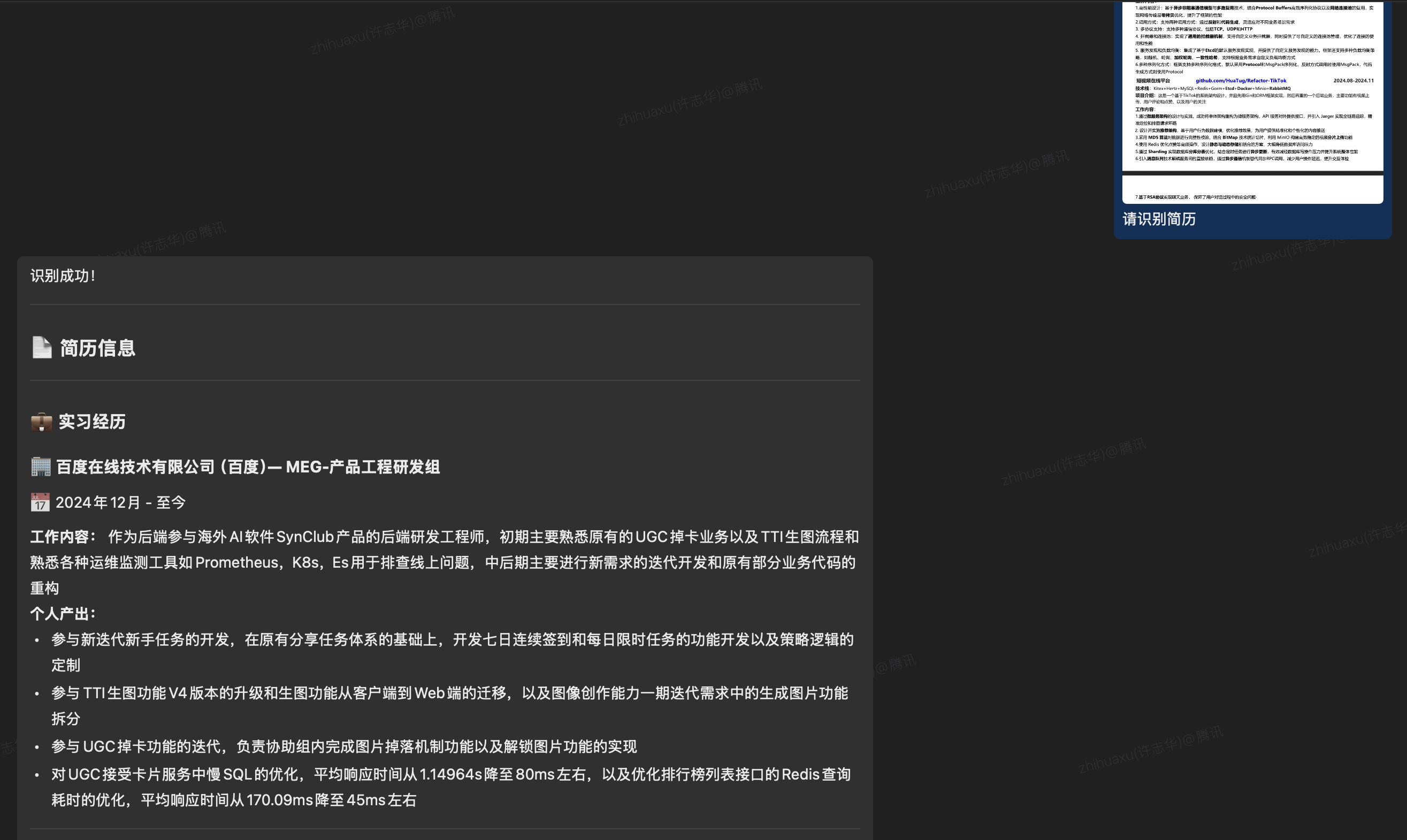 3、上传简历图片,并发送“请识别简历”,简历信息会如下图结构化呈现。