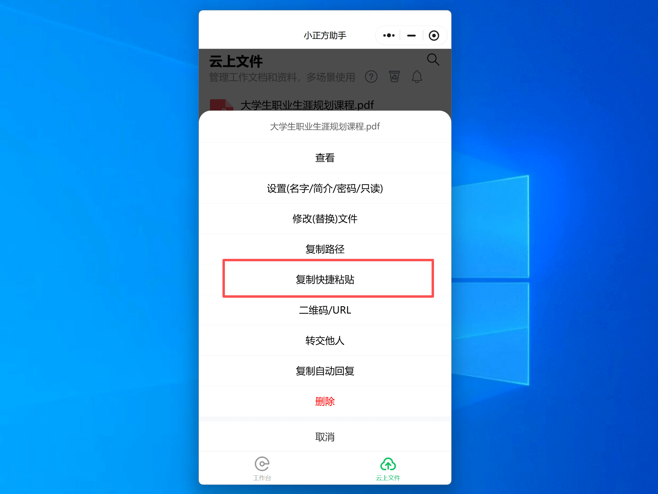 点击云上文件列表中的对应文件,点击“复制快捷粘贴”,进入复制。