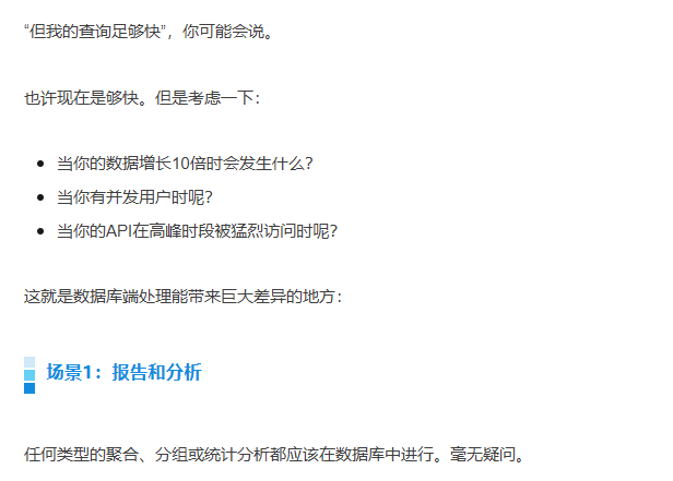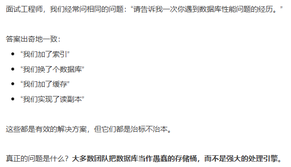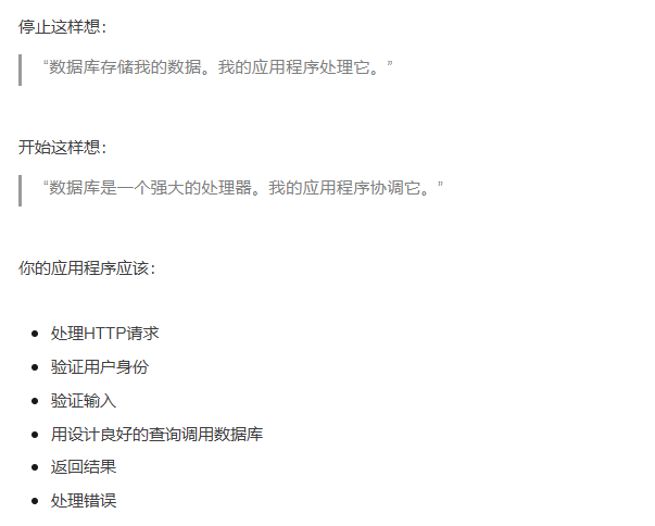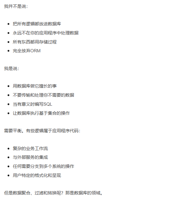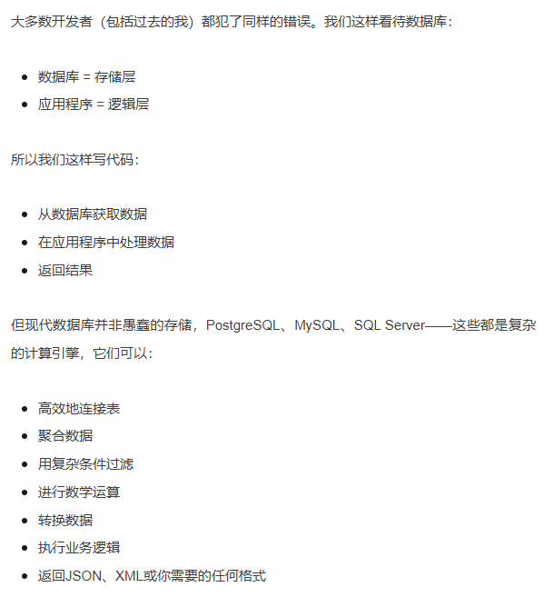 文章的核心,倡导我们不要将数据库当作愚蠢的存储桶,而是开始就将它当作强大的计算引擎来使用,