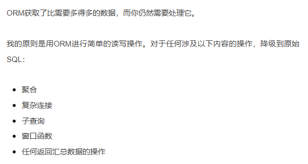 ORM对于CRUD操作来说很棒。但对于复杂查询来说它们很糟糕,因为它们强迫你从对象的角度思考,而不是集合的角度。