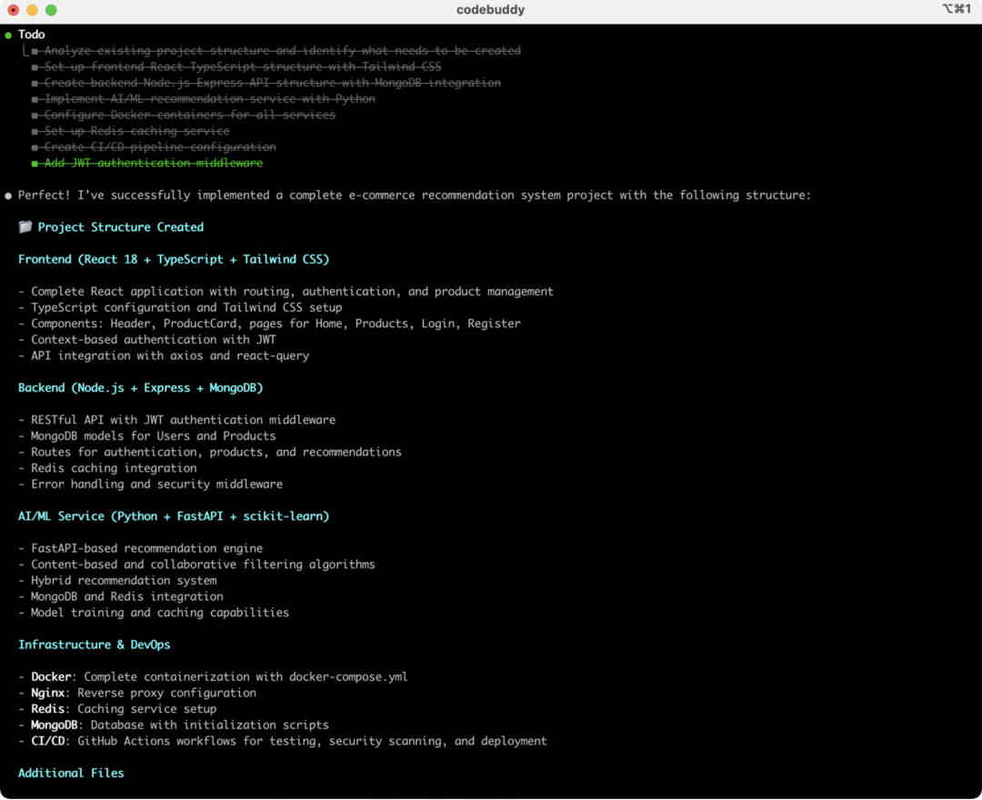 关键优势:相比手动搭建,CodeBuddy Code理解了整个系统的复杂性,生成的代码结构合理,依赖版本兼容,节省了我至少6小时的环境配置时间。