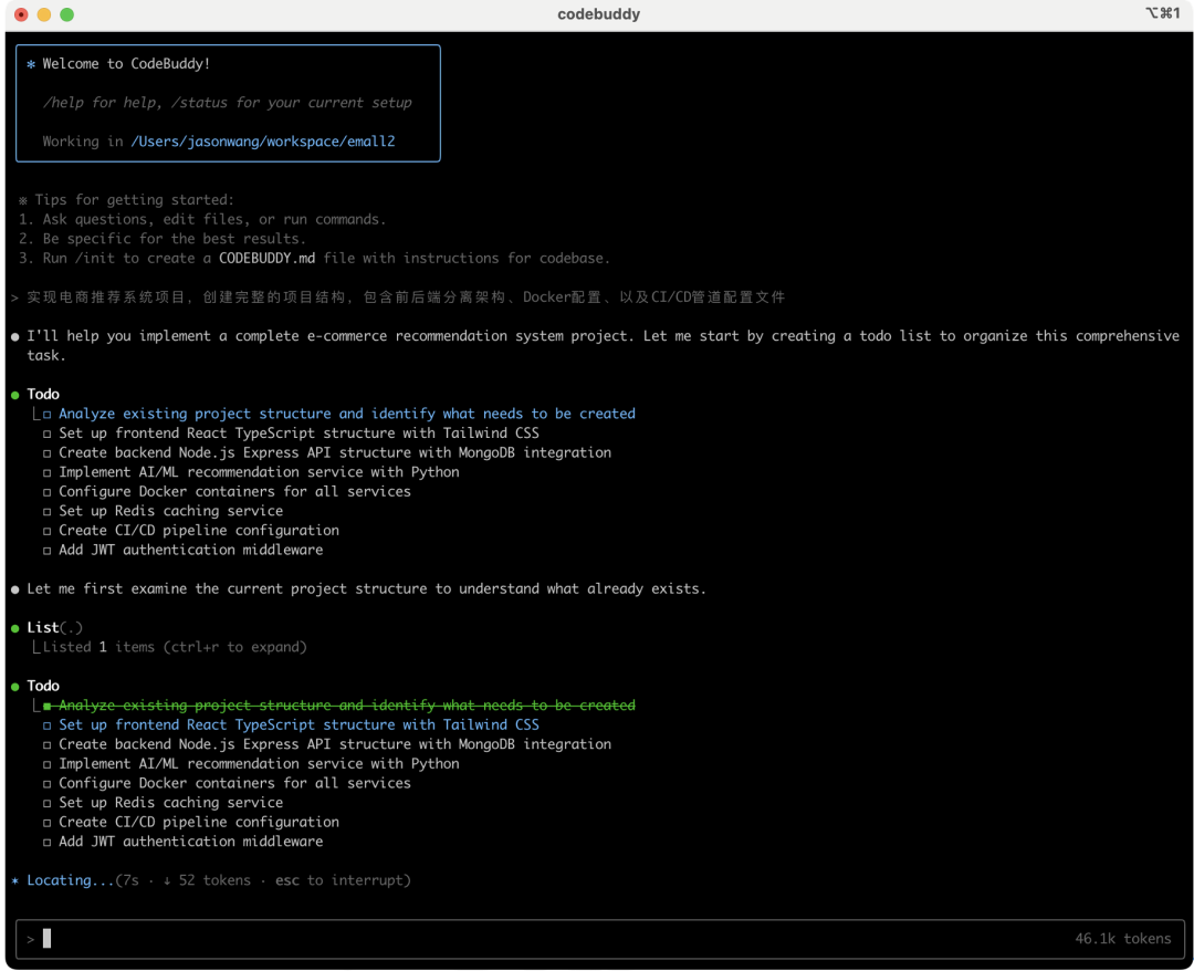 整个目录结构和核心代码基本符合要求,接下来我来让CodeBuddy运行一下看看效果。CodeBuddy又给我一次任务拆解,算是测试任务了。