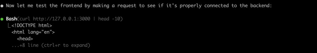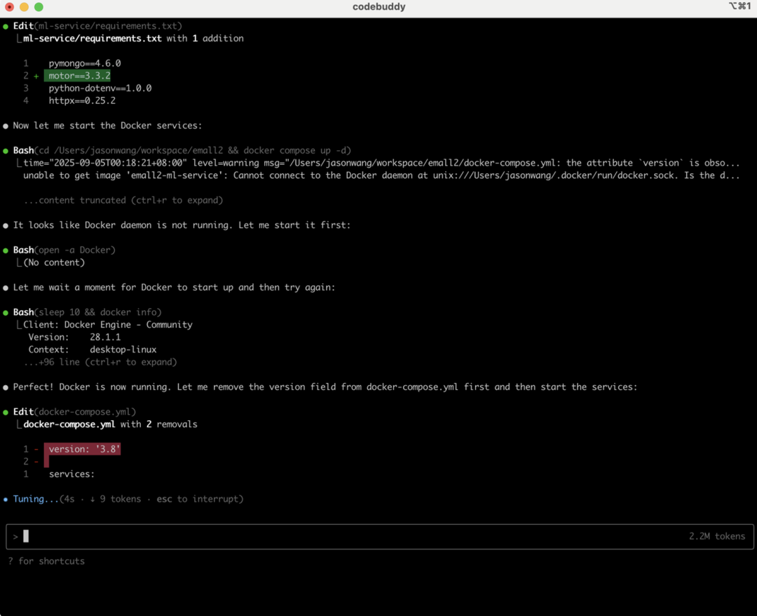 接着开始修改配置,启动docker,修复和安装必要的版本库,拉起中间件如redis服务、mongodb等。这里就体现了终端的强大优势和连接性。软件工程的运行构建发布本质是终端环境,所以终端上内置bash可以运行一系列的构建脚本,从而AI Agent完成复杂的软件开发、测试、运维等环节。