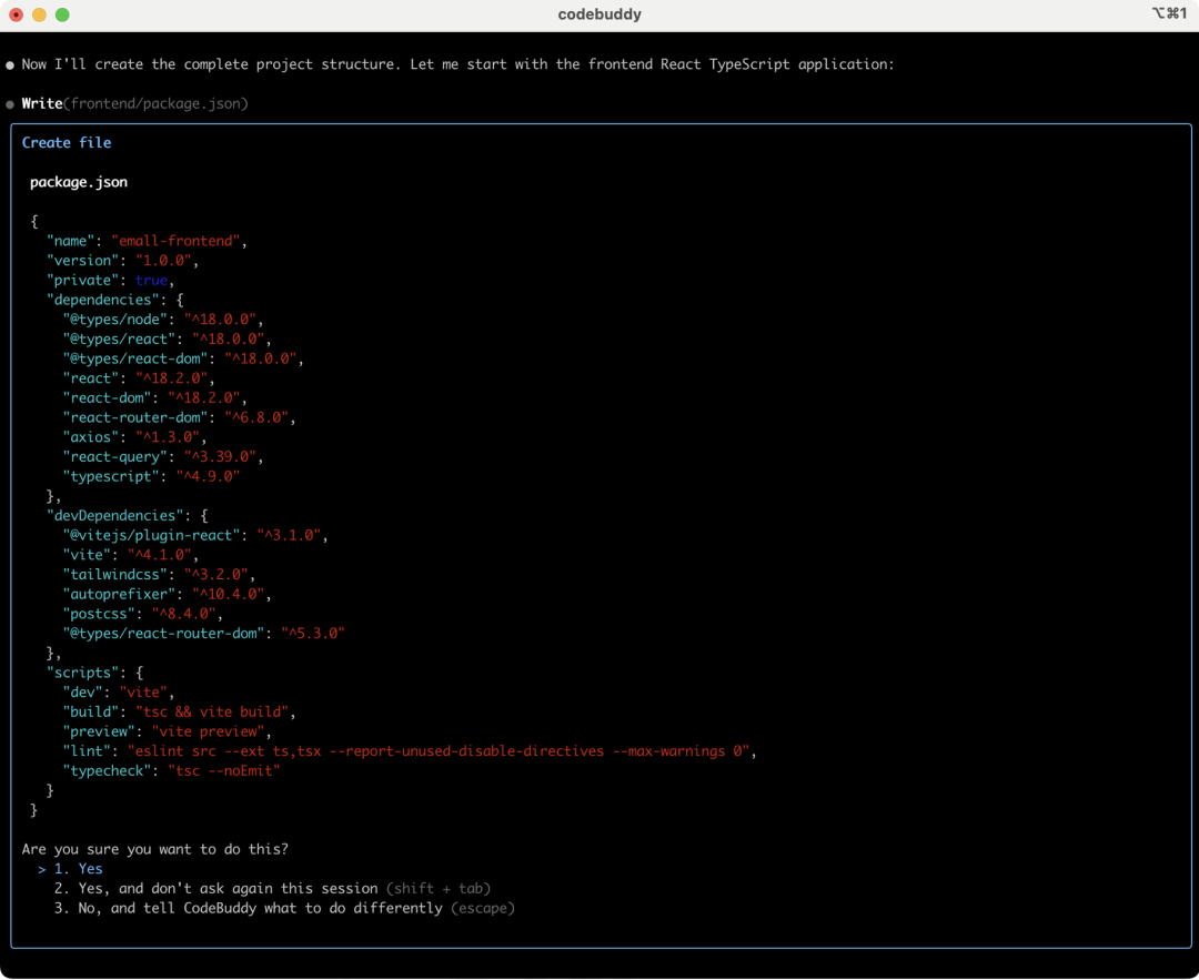 下一步CodeBuddy开始依次执行,执行前会给出确认提醒: