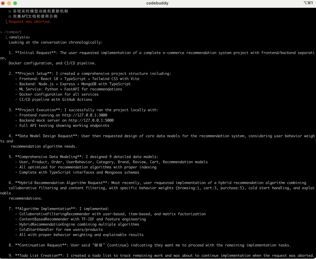 由于我长时间在一个会话中生成复杂应用,在快接近上下文的时候,CodeBuddy启动了压缩,从而保持一个更干净的运行环境。Ctrl+R展开后可以看到里面是过往请求和关键会话的总结。