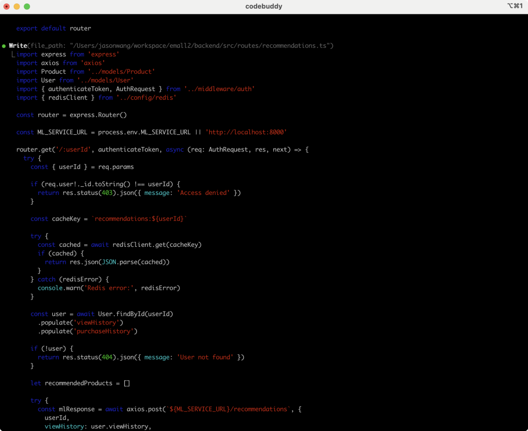 CodeBuddy Code最令我印象深刻的是其对项目整体架构的理解能力。它不是简单的代码生成工具,而是能够理解业务逻辑、技术架构、数据流向的智能助手。