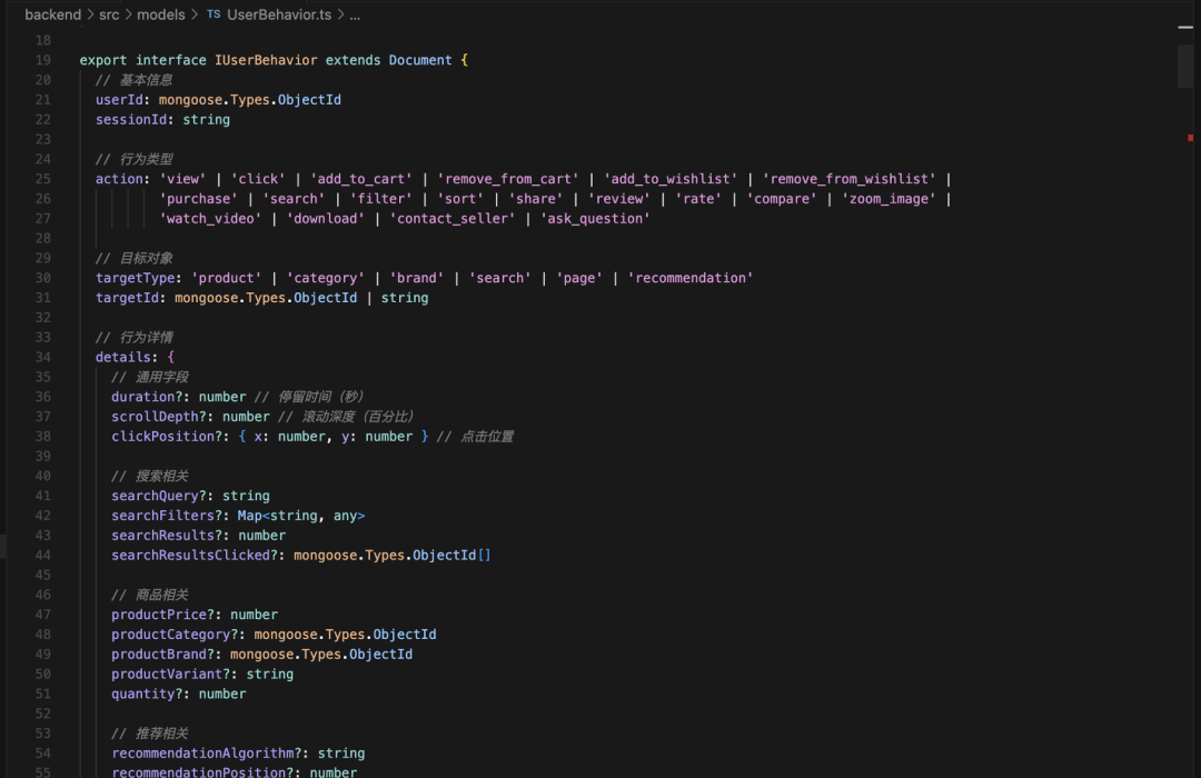 基于电商推荐场景,设计用户、商品、订单、用户行为等核心数据模型,使用Mongoose ODM,考虑推荐算法所需的数据结构