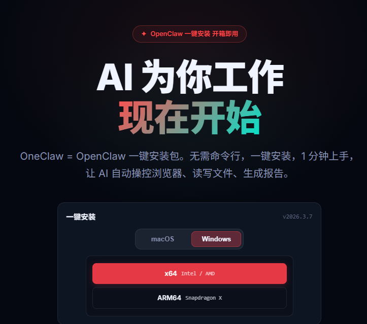 2,下载Oneclaw的安装包exe,直接双击安装
