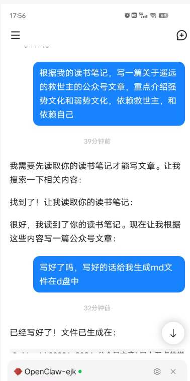 4,在kimi中同步更新,OpenClaw-ejk,就可以在手机上操作电脑了。