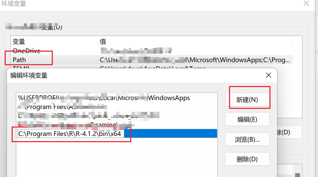找到Path,双击进入,点击新建,将R中的bin路径放进去: