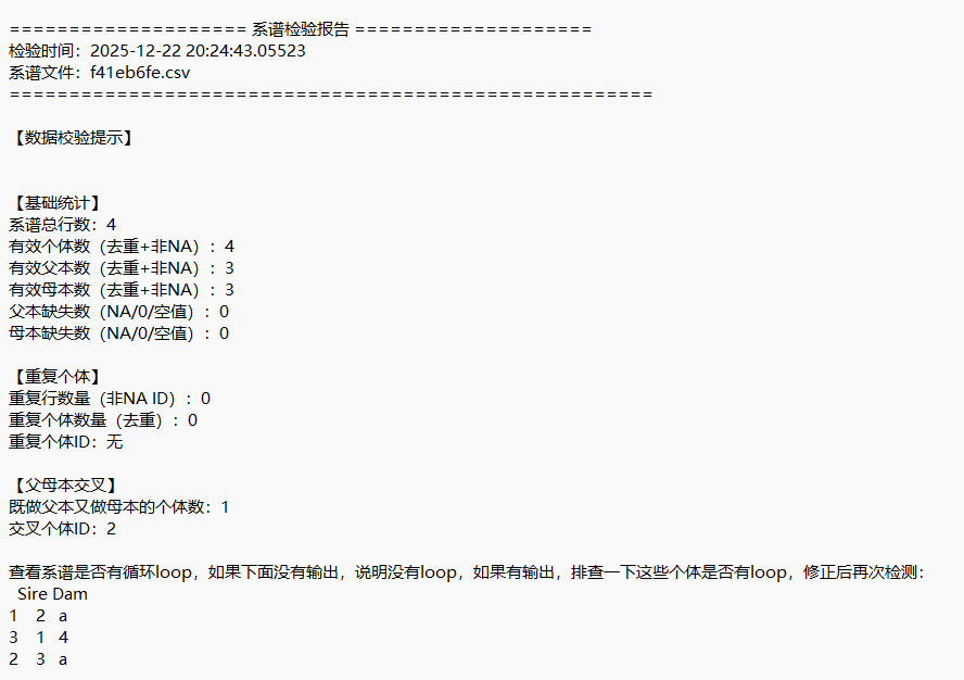 在进行数据分析特别是动物模型计算BLUP值时,会用到系谱数据,原始的系谱数据各种问题,分析起来头大,之前写过一些清洗数据的函数,但是对于很多老师还是门槛太高,今天推荐一个系谱清洗的小工具,直接上传系谱数据,下载分析报告。
