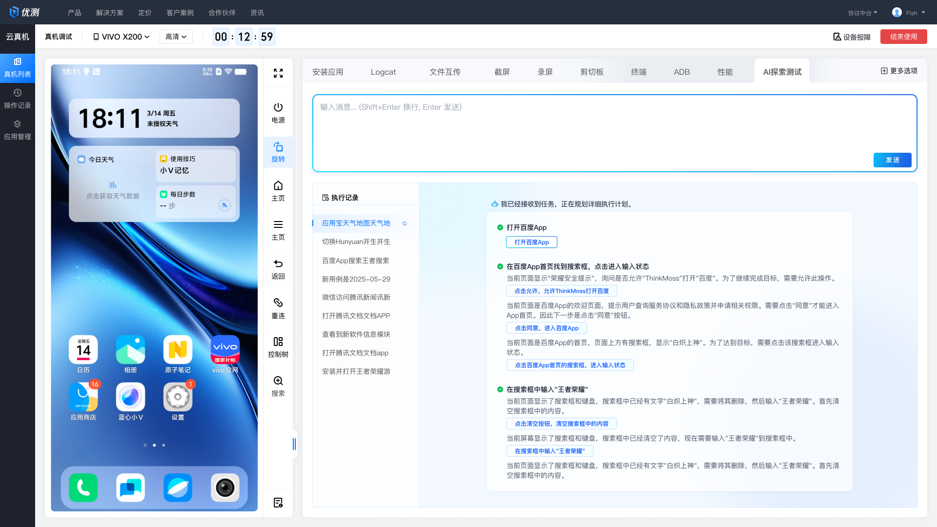 优测云真机平台本次升级将前沿的 AI Agent 与真实的移动设备操作环境深度融合,为开发者和测试工程师配备了一位不知疲倦的智能副驾,让 AI 直接为你操作真机,为研发测试工作方式带来无限可能。