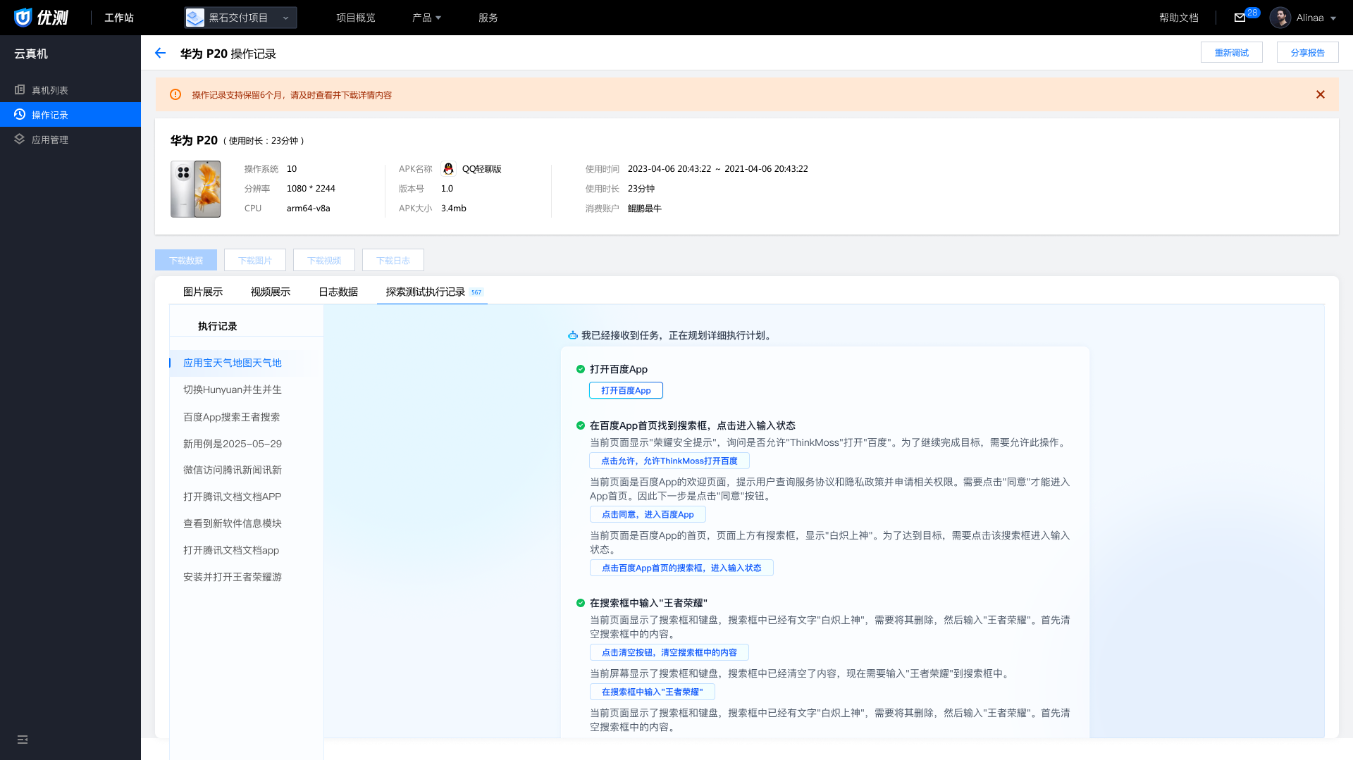 详尽的操作记录与 AI 执行日志。每次测试执行都会生成完整的日志,包括每一步操作截图、时间戳、操作类型和结果状态,为问题排查和测试分析提供全面数据支持。