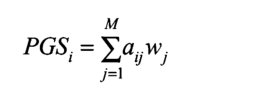 一般来说,我们可以将一个人的多基因得分定义为一个人在M基因座的基因型的加权和。个体i的PGS可以计算为每个SNPj=1的等位基因计数A(0、1或2)的总和。⋯..M、 乘以重量w,